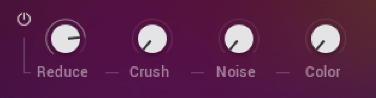 Reduce: Re-samples the signal to an adjustable sample rate. The re-sampling is done without any kind of (usually mandatory) low-pass filtering, which causes all kinds of wonderful aliasing artifacts. The sample rate goes all the way down to 50 Hz, which will omit most of the original signal. When the control is in the left-most position there is no reduction. Turning the control right reduces the sample rate.