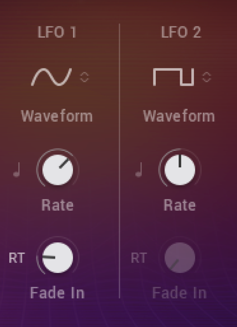Fade In: If this value is greater than zero, the LFO will not start the waveform immediately when a note is received, but rather smoothly ramp it up over a time of up to 10 seconds. This parameter is only available when RT is activated.