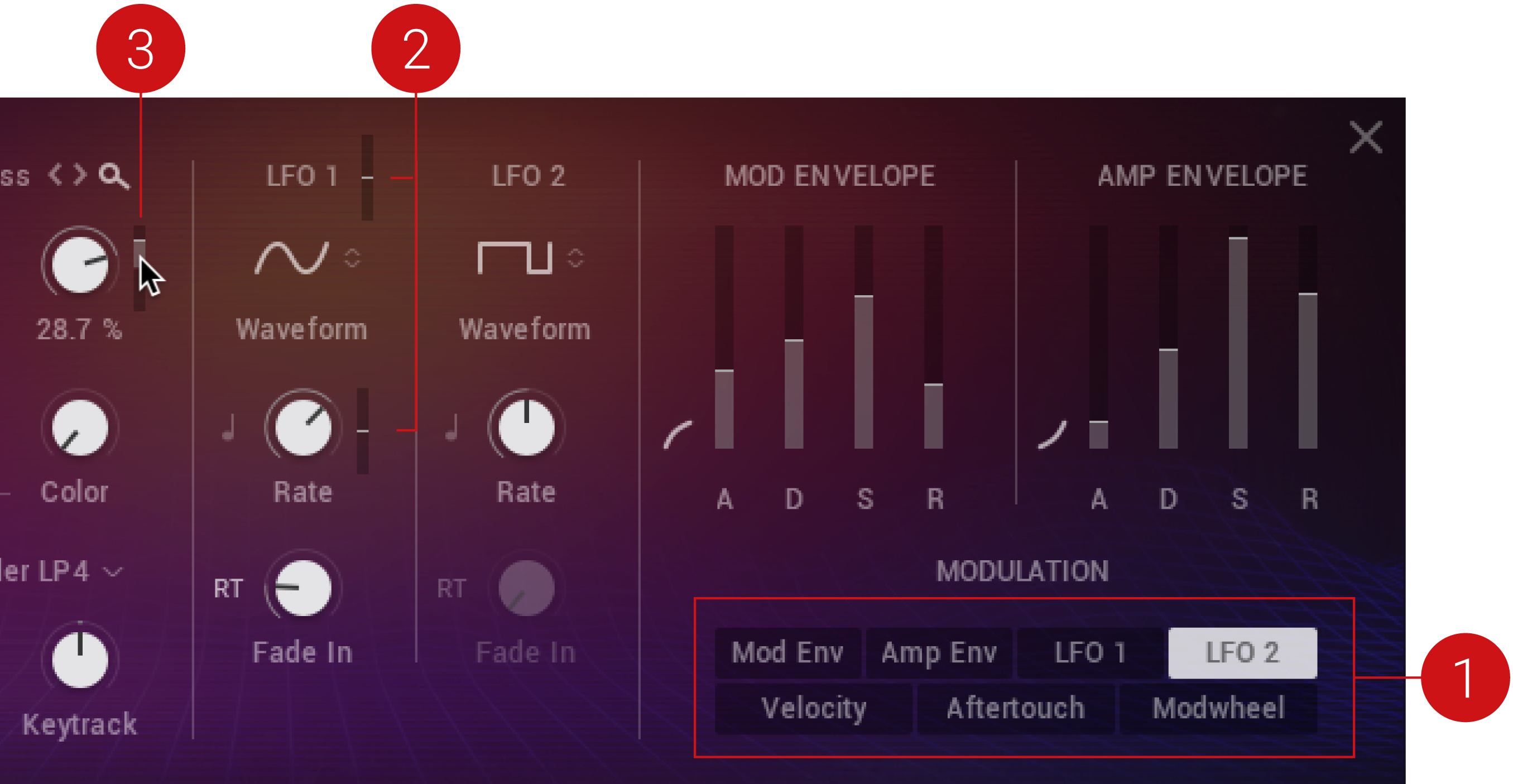 Modulation Sliders: When a Modulation Source has been selected, sliders appear next to the relevant parameter controls that are available for modulation.