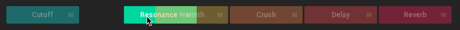 1. Macro Controls: Each colored block represents a macro control. Click on a macro to display the group of parameters assigned to it and access the parameters' editing tools. Click + drag a colored block left or right to rearrange the order of the six macro controls. For more information, refer to Macro Assignments.
