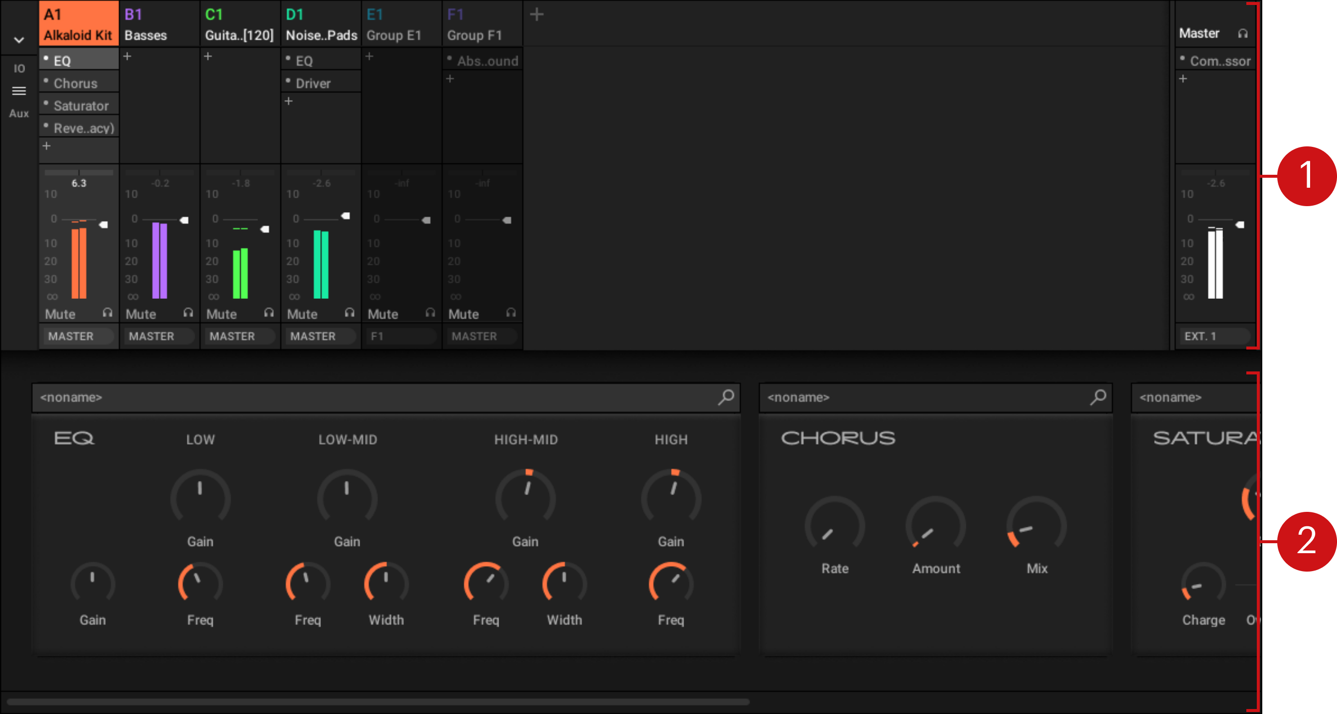 2. Plug-in Strip: In the lower part, the Plug-in Strip displays the series of Plug-ins loaded in the focused channel (Sound, Group, or Master). You can adjust the parameters of each Plug-in in its own interface. See section The Plug-in Strip for a detailed description.
