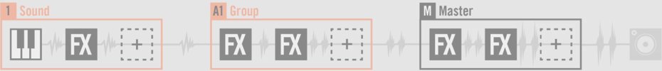 MASCHINE bietet eine große Auswahl an Effekten, die sich auf Sounds, Groups und den Master-Kanal anwenden lassen. Die folgenden Grafiken zeigen dir, wie der Signalweg diese drei Ebenen durchläuft.