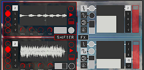 * White controls at bottom right of Shifter are the volume (horizontal fader) and granular start/stop (white circle)