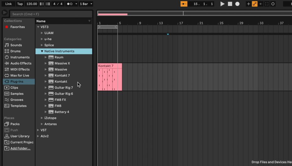 Abre Raum, una reverb creativa que añade profundidad a tu sonido, en la misma pista que Kontakt. El efecto se aplicará a tu sonido.