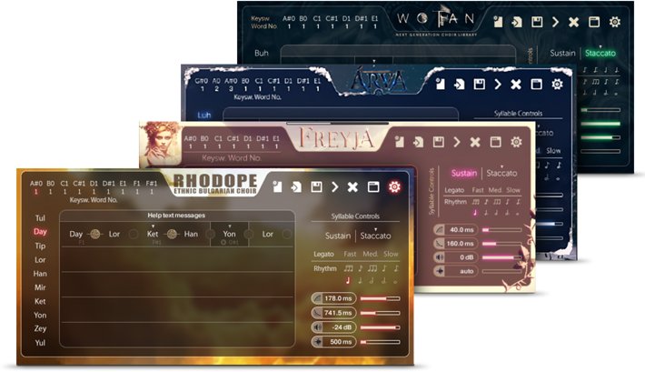 Conjuntos corales potentes que logran resultados realistas y llenos de vida. Dividido en cuatro coros potentes y auténticos de Europa del Este. Incluye Wotan Male Choir, Freyja Female Choir, Arva Children Choir y Rhodope 2 Ethnic Bulgarian Choir. Estas bibliotecas grabadas con todo detalle las han elaborado profesionales con experiencia en infinidad de películas y videojuegos de primer nivel, lo que las hace imprescindibles para composiciones de videojuegos y género fantástico. Portado dentro del potente motor Syllabuilder: el legato polifónico auténtico de Strezov ofrece la máxima flexibilidad dentro de cada patch.