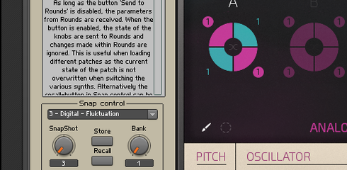 This instrument allows for storing/recalling patches of the single synths. The parameters of the currently selected synth are stored internally and can be saved as snapshots. These snapshots can later be recalled into the currently selected synthesizer of Rounds.