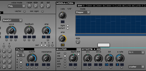a FX section including reverb, delay, chorus, phaser, flanger, crusher and EQ (three of them can be stacked)