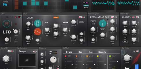 The Resonator Bar is run through a variation of Joey Valizan's ISHH, which acts like a pitch-dropping reverse delay. This makes all sorts of strange sounds possible. The High Hat is processed by Stephen Lovesey's Stereoizer, which manipulates its stereo image, and can lead to some very cool effects.