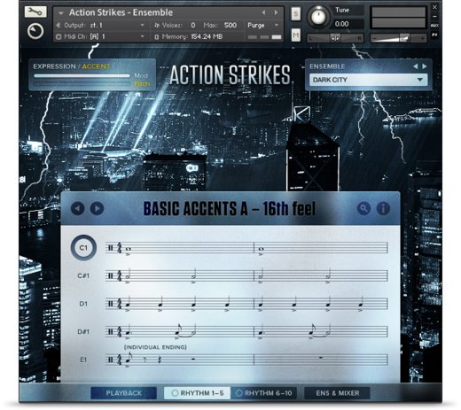 ACTION STRIKESではライブ・パーカッション・アンサンブルを思いのままに指揮できます。直感的に操作できるキースイッチを使って、左手でアクセントをコントロールし、右手でバリエーションを選択して、リズムを柔軟に変更できます。