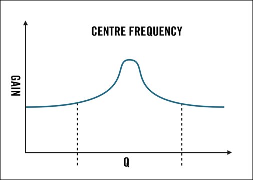 また、パラトリックEQはゲインや周波数のコントロールの他に、Qコントロールもあります。Qとは調節に使われている曲線の幅、つまり帯域幅のことです。 高いQ設定は低い帯域幅と狭い曲線、つまりスパイクのようなものを意味しています。低いQ設定では、広い曲線が得られ、広域の周波数をカバーします。