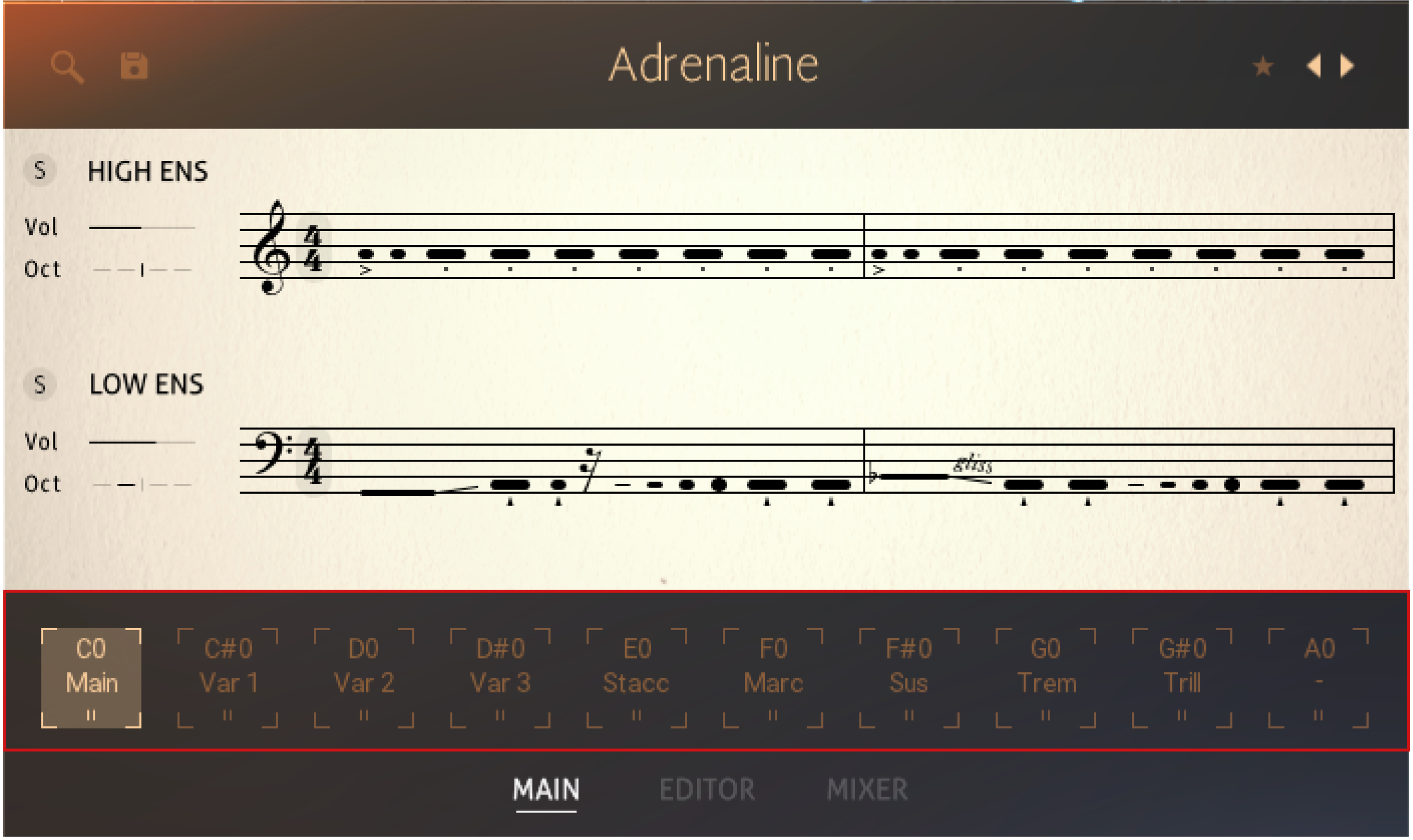 Ensemble selector: By clicking LOW ENS or HIGH ENS you will browse Phrases for the Low Ensemble or the High Ensemble, respectively. The selected Ensemble is highlighted.