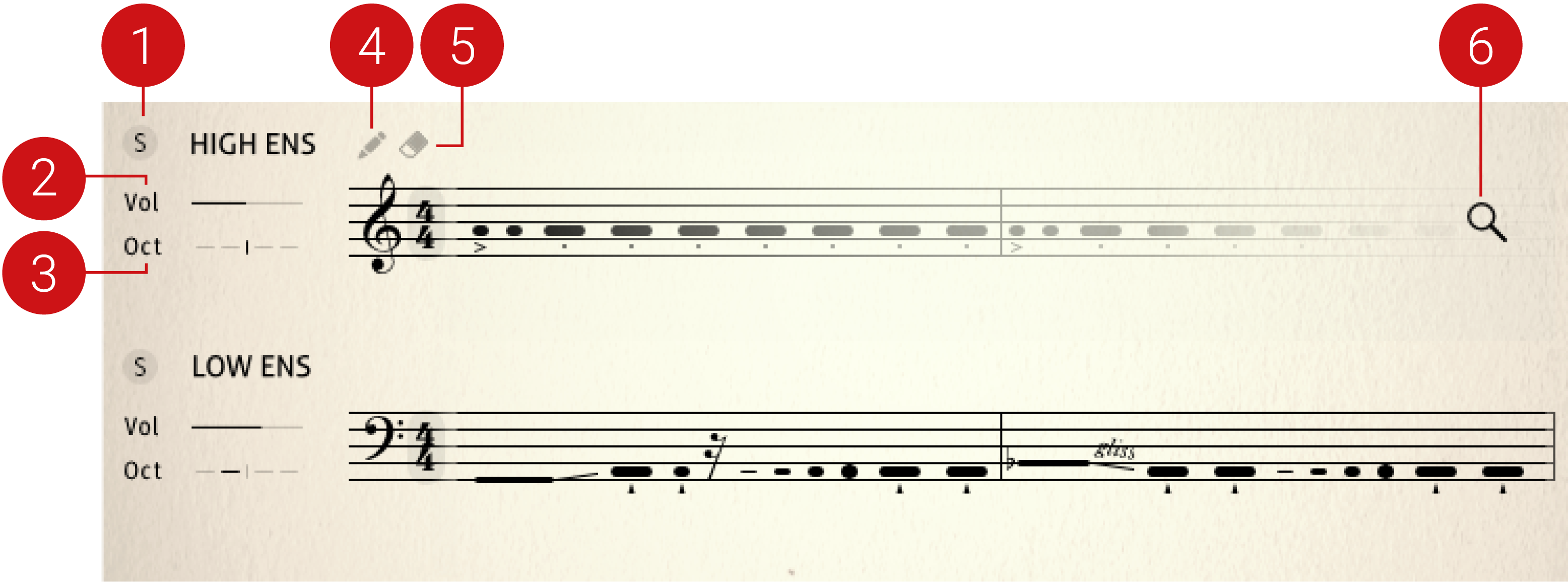 Phrase display: Shows the Phrase content in a score-like representation. The Phrases are notated in treble and bass clefs for the High and Low Ensembles, respectively, and are always depicted using A as the root note. The actual sounding pitch will be based on whatever notes you play on your keyboard. The actual sounding pitch will be based on whatever notes you play on your keyboard. You can click anywhere in the Phrase to open the Phrase Browser and select another Phrase for that Ensemble. This is equivalent to clicking the Browse button (magnifying glass) that appears on the right.