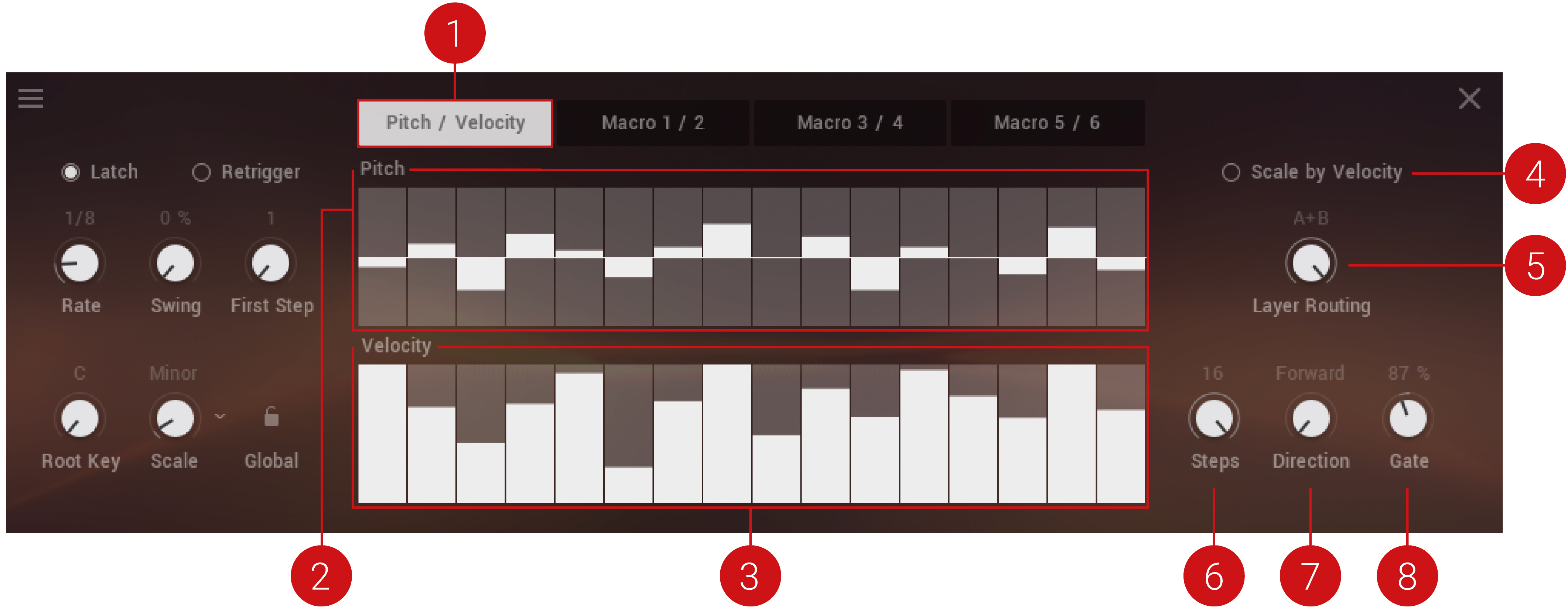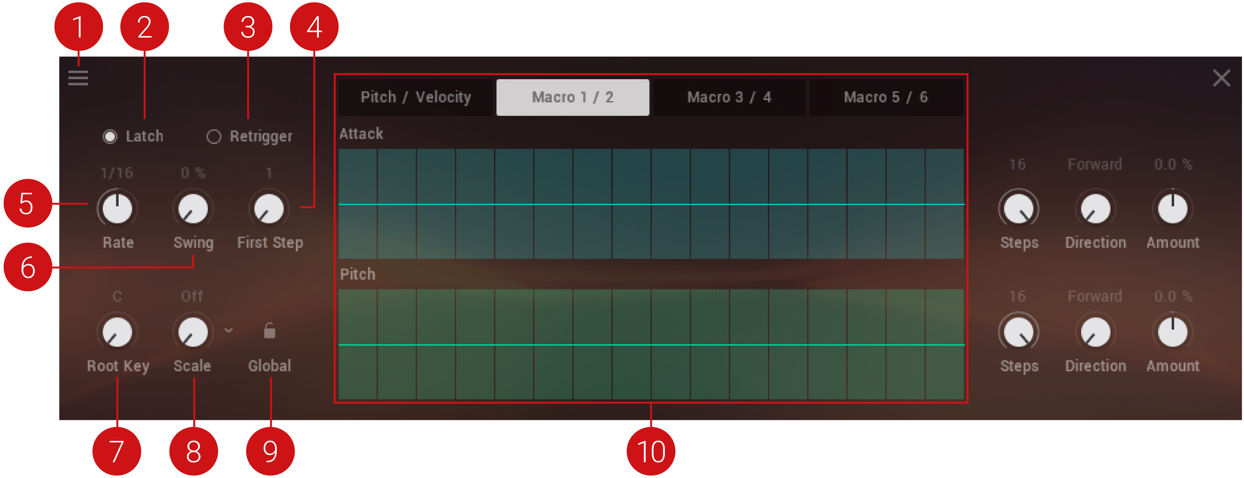 Macro Sequence Lane: Draw in the modulation amount for the corresponding macro. Press [Ctrl] / [Cmd] + click any step to reset any its current modulation value.