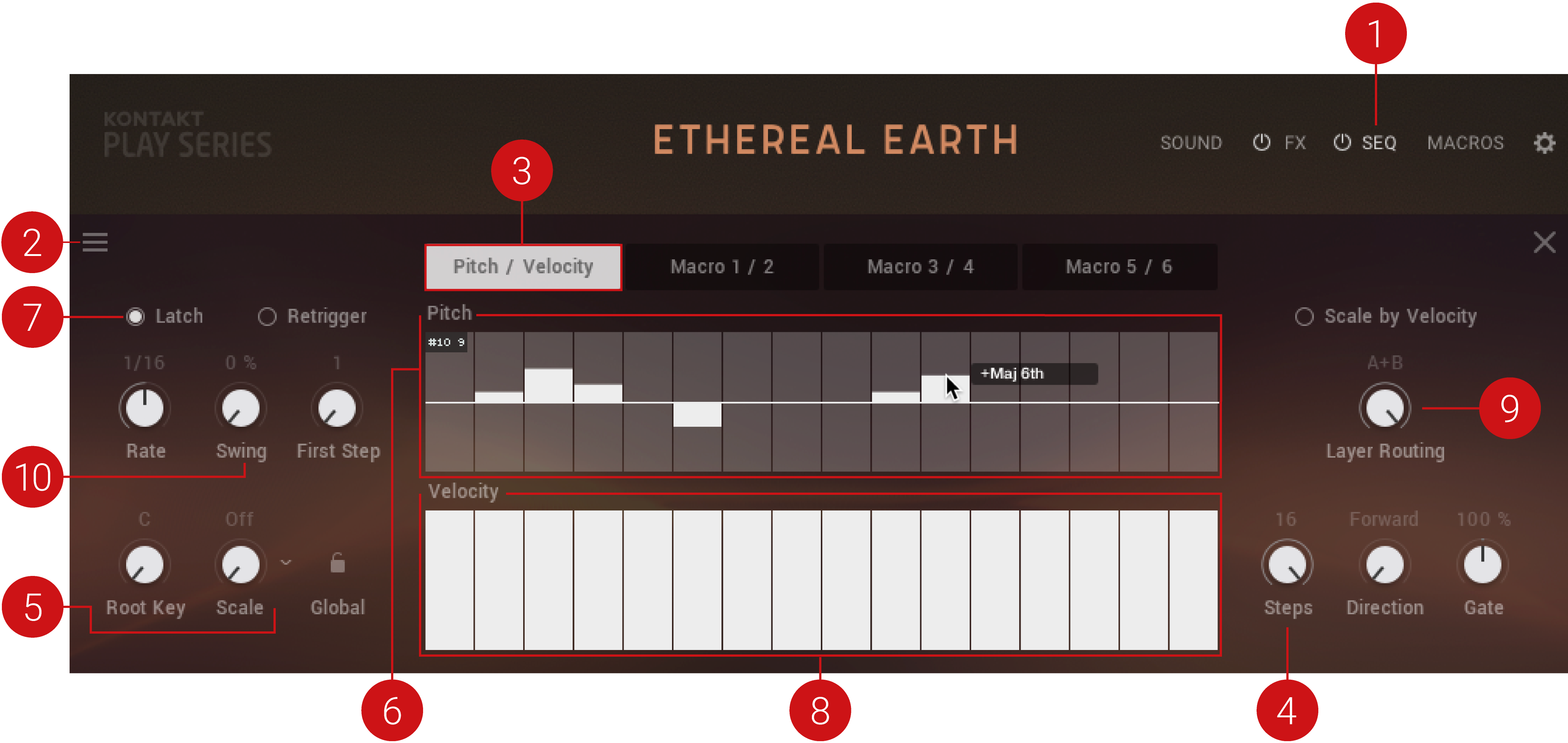 ETHEREAL EARTH replicates the power and functionality of an analog sequencer. Accessed via the SEQ tab, the sequencer provides one lane for creating a melodic sequence of up to sixteen steps, and a further six lanes to modulate each of the macro controls and its respective assignments. These additional sequencing lanes allow you to shape your sound with precision and nuance over the course of a sequence.