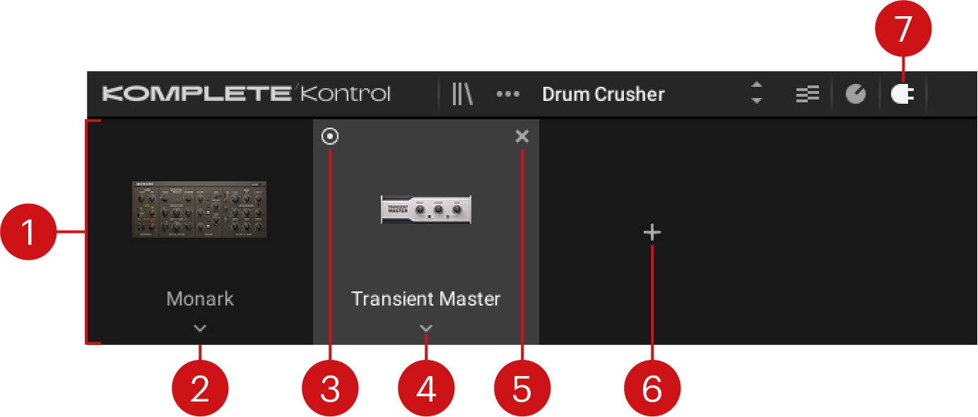 This sections describes how to use plug-ins in Komplete Kontrol, from instruments to loops, one-shots, and effects. Plug-ins can be loaded and organized in the Plug-in chain.