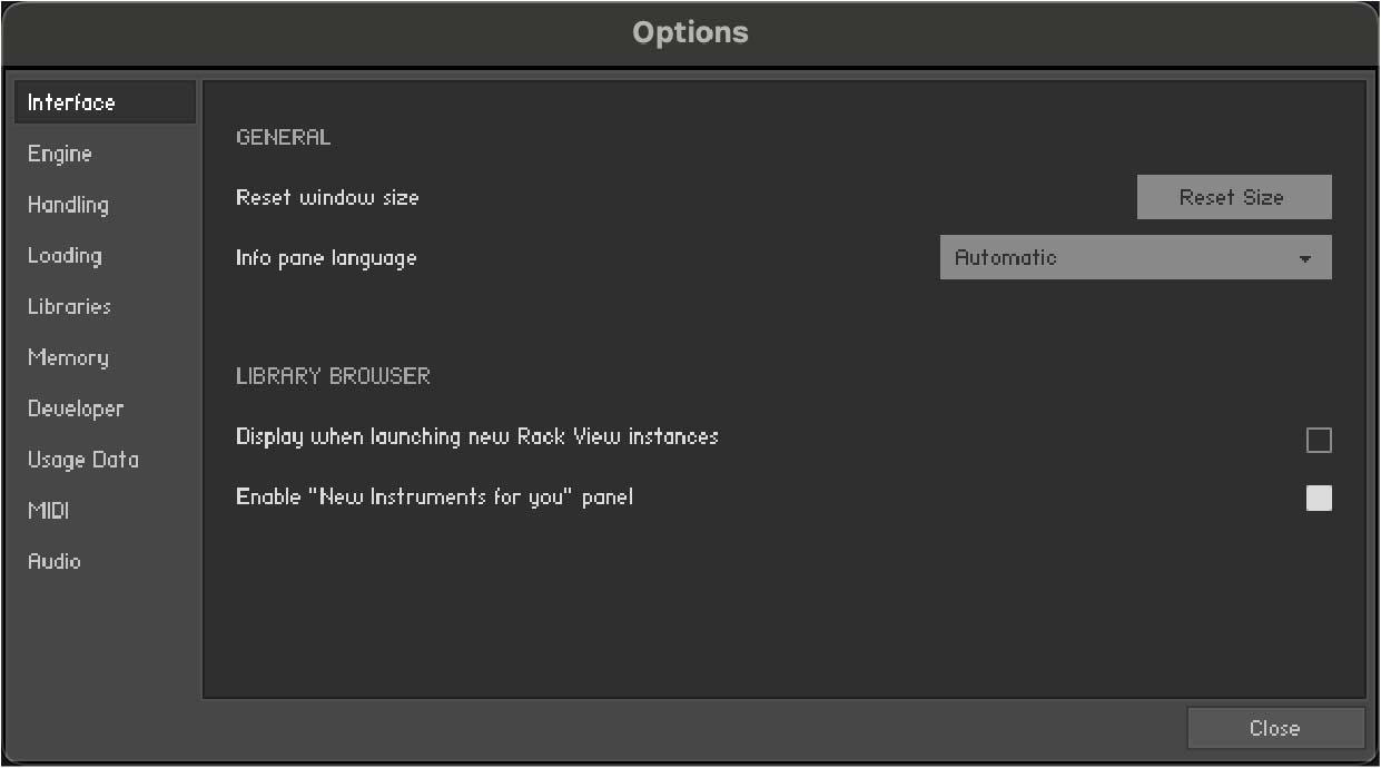 Display when launching new Rack View instances: When this setting is enabled, creating a new Rack View instance will launch with the Library Browser as first screen.