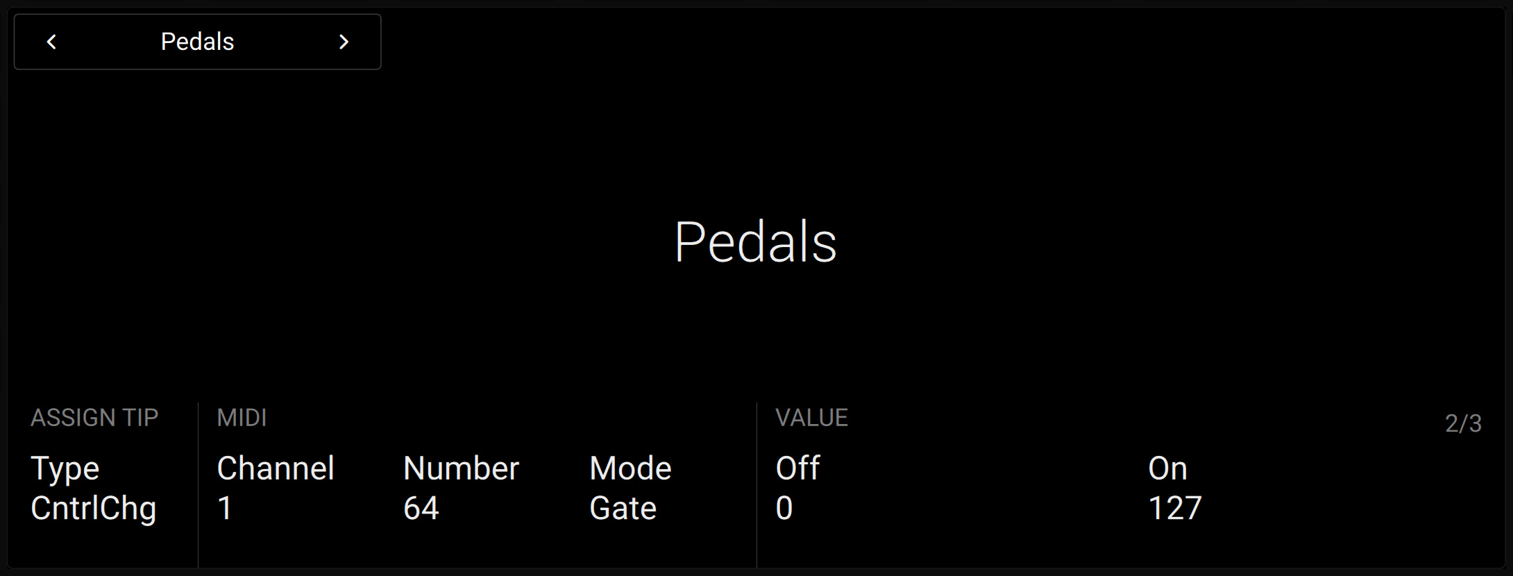 Toggle: The pedal can have two values. Each pressure on the pedal switches to the other value.