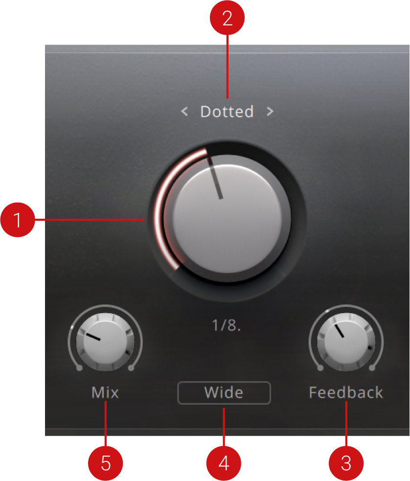 1. Time: Adjusts the delay time. Depending on the selected Time mode, the delay time is either synchronized to the tempo of the DAW and set in note divisions, or freely adjusted in milliseconds.