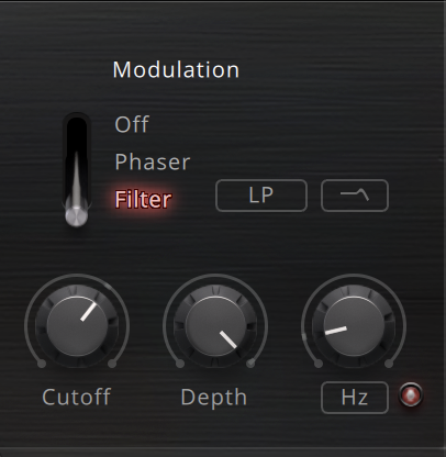 LP/HP/Notch: Switches between three different filter modes that determine the basic sound character, LP (low-pass), HP (high-pass), and Notch.