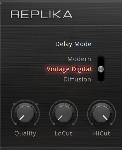 The Vintage Digital style emulates the warm and crunchy sound of early digital delay effects. Four different Quality settings available, ranging from a bright sound with subtle textures to strong digital artifacts. The sound of the delay depends on the delay time. As the delay time is increased, the delay repeats will become grittier, with more digital artifacts being introduced to the signal. Adjusting the delay time alters the pitch of the delay signal, which can be used creatively.