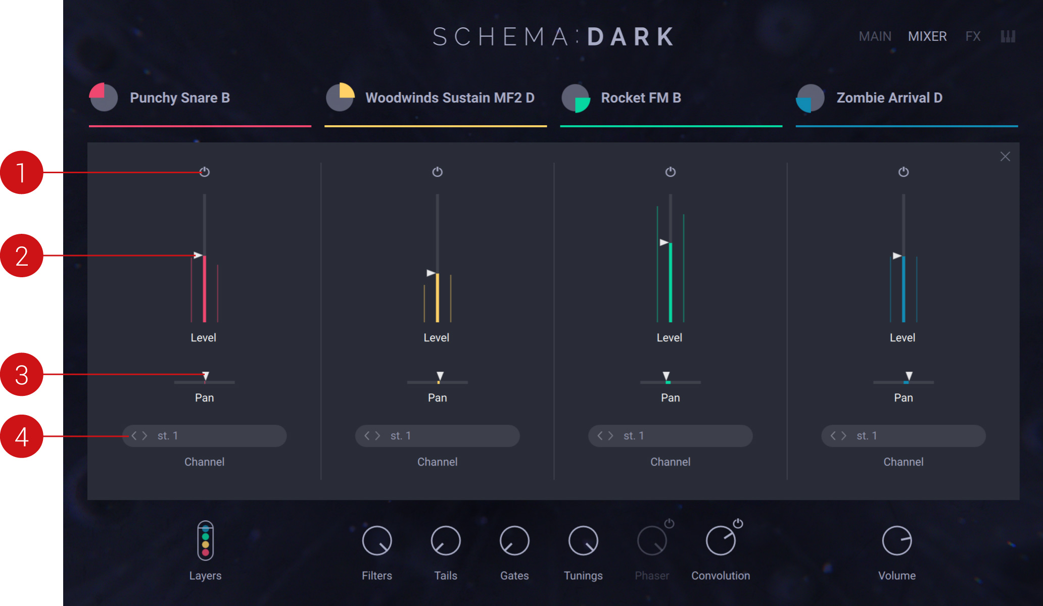 The Mixer page of SCHEMA: DARK enables you to mix and balance the individual layers.