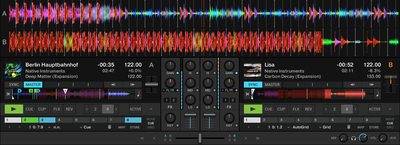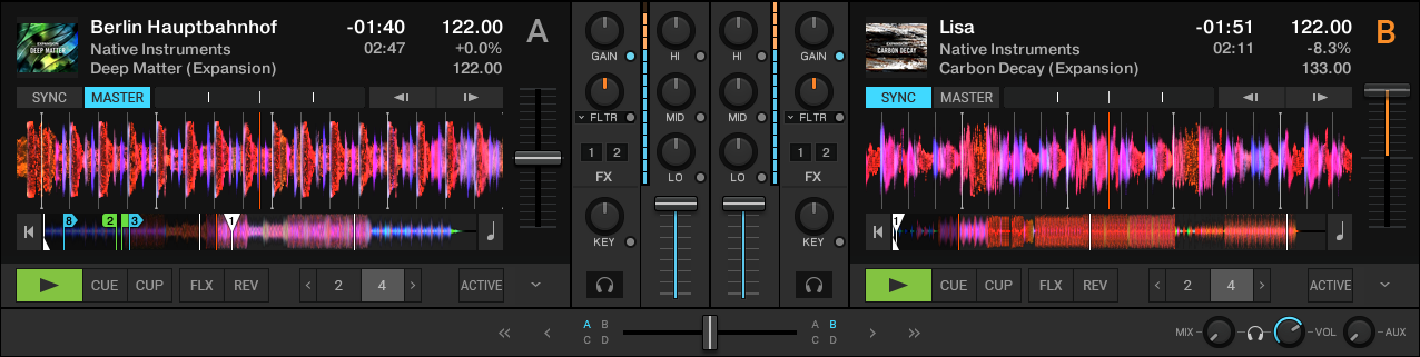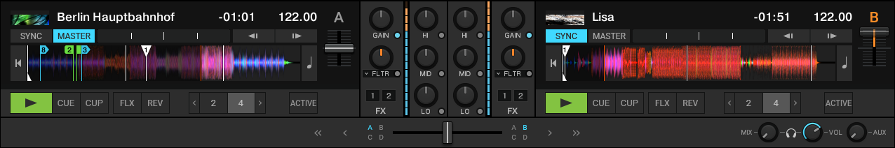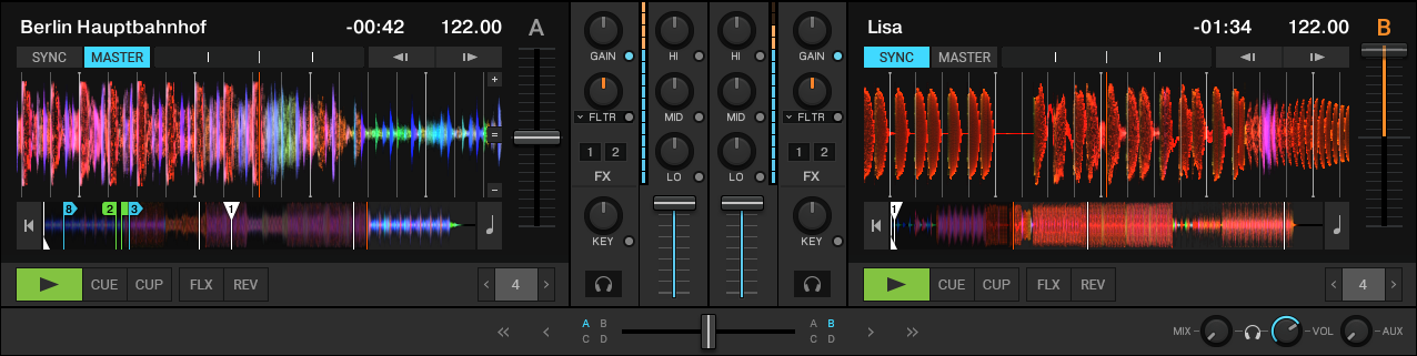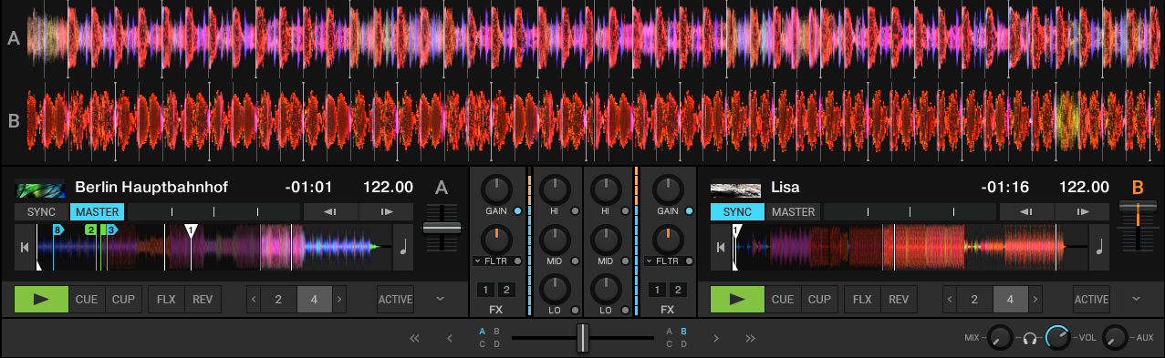 The Parallel layout shows the waveforms stacked above the decks to support you on mixing tracks visually even without using SYNC and prelistening. The waveforms reach over the entire application window to give you a wider view on the tracks. This lets you quickly switch between the tracks. The parallel beatgrids indicate to what degree the tracks are in or out of sync without relying on prelistening. The Parallel layout also works for mixing with four decks.