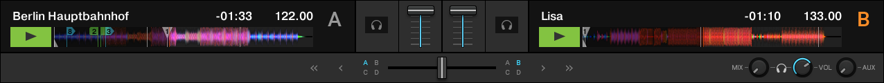 The Essential layout shows the most important control elements for basic mixing. The decks show the waveforms, stripes and the transport controls. The Essential layout is optimized for using an external controller as the internal mixer is not shown.