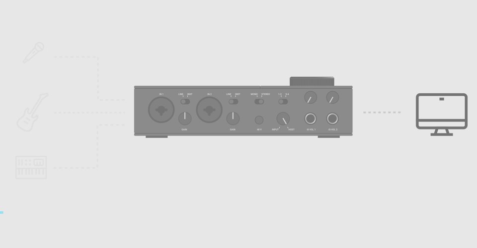 You can listen to the input using headphones directly via the KOMPLETE AUDIO 6. First, turn the INPUT/HOST knob to the left (INPUT). Then adjust the 1-2/3-4 and the MONO/STEREO switches as follows: