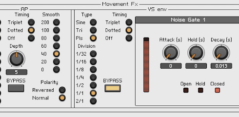 The Volume Shaper is an LFO controlled noise gate. The Noise gate was built by (Peter Whiting 2009). The attack, Hold, and decay are in increments of Milliseconds but the overall is Seconds.